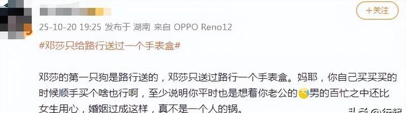路行在节目中对邓莎的职业经历提出看法,认为邓莎在巅峰期从未成为女主角,角色多为宫女或丫鬟类型,未来成功属于概率问题。他强调邓莎不生儿子也未必能拥有当前生活,暗示生育为其提供了价值。节目中还提到邓莎的情感需求未得到满足,她希望路行主动分享工作挫折,但路行属于独自消化类型,不愿过多表达。两人沟通频率低,每周少于一次,路行在事业低谷时未从邓莎处获得安慰。邓莎的购物习惯也被提及,她在不开心时通过消费缓解,路行对此未设限制,仅以金钱解决问题的态度回应。多年来,邓莎给路行的礼物仅限于一个表盒,而路行在2009年赠给邓莎第一条狗,此后邓莎陆续收养流浪狗,总数达6条。